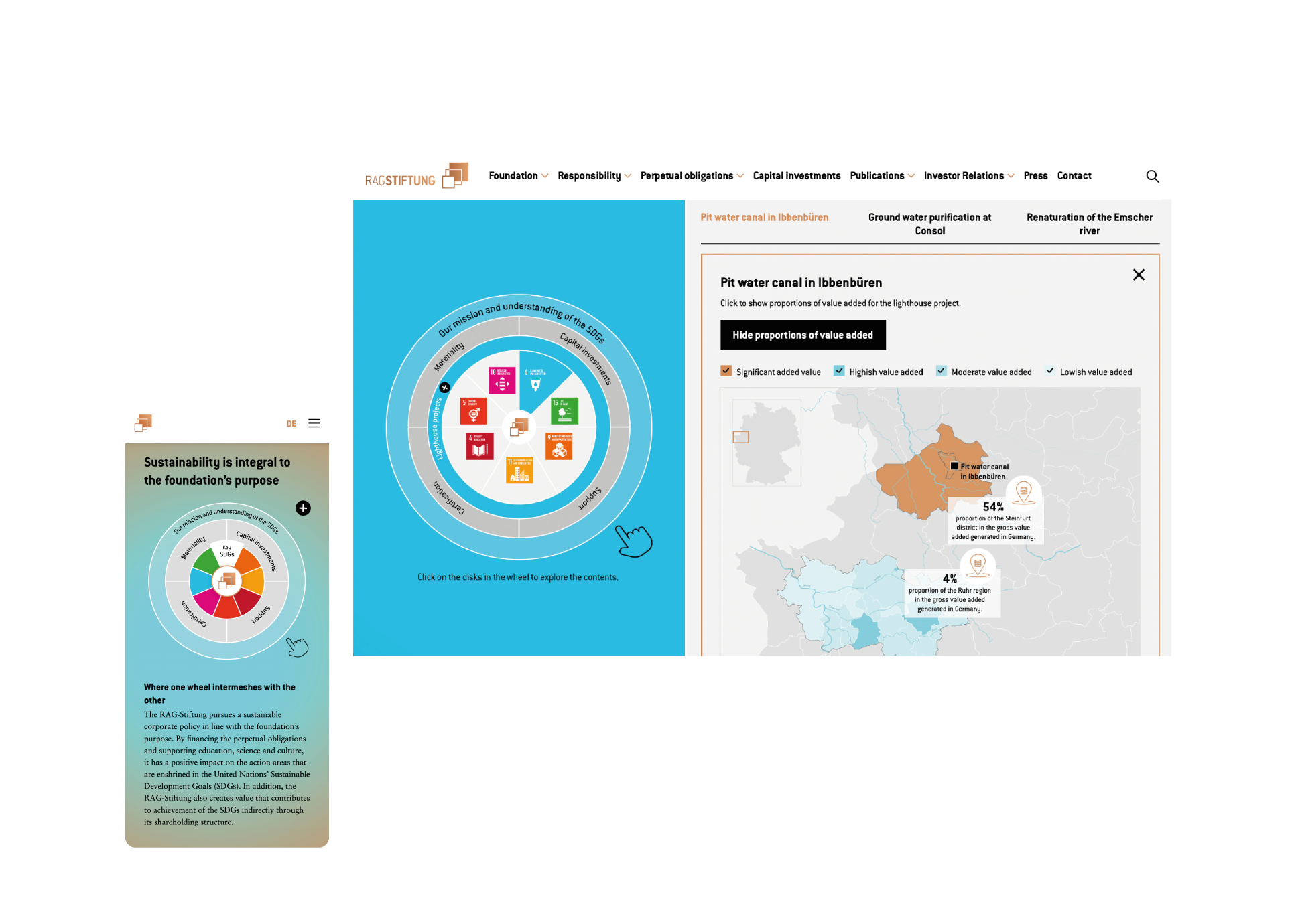 Our info tool on the United Nations’ Sustainable Development Goals (SDGs) provides extensive background knowledge on the economic, environmental and social impact of the RAG-Stiftung and its major associated companies. That is done with reference to seven focus SDGs on which the RAG-Stiftung concentrates pursuant to its articles of association. The SDG tool also provides an exclusive insight into specific key figures on the RAG-Stiftung’s contributions to society, based on gross social value added and employment effects.