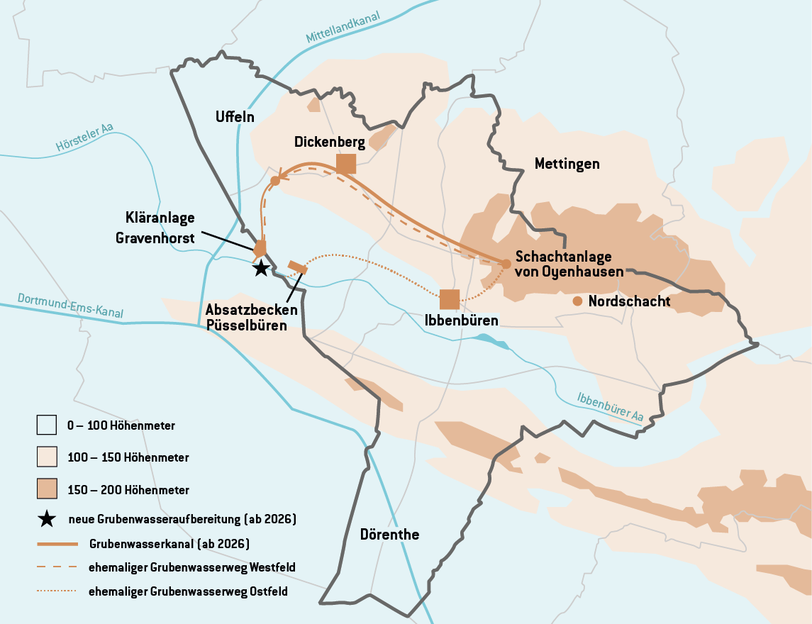 Im Westfeld des Bergwerks Ibbenbüren wurde der Pumpbetrieb unmittelbar mit Beendigung der Kohleförderung eingestellt. Bis Jahresende 1982 erreichte das Wasser wieder einen Pegel von 65 Metern über Normal Null. Von dort fließt es über den Dickenberger Stollen über das natürliche Gefälle zur Aufbereitungsanlage in Gravenhorst ab. Im Ostfeld dagegen laufen die Pumpen weiter. Allein der Energieeinsatz dafür ist erheblich: Zu Zeiten des aktiven Bergbaus entsprach er dem Durchschnittsverbrauch von 12.900 Haushalten. Das Grubenwasserkonzept für Ibbenbüren sieht deshalb vor, die Pegel im Ostfeld entsprechend der guten Erfahrungen im Westen auf das gleiche Niveau ansteigen zu lassen. Um West- und Ostfeld gemeinsam zu entwässern, wird der Dickenberger Stollen durch einen neuen Grubenwasserkanal ersetzt. Bis Ende 2024 soll die untertägige Anlage fertiggestellt sein. Von diesem Zeitpunkt an wird die gesamte Aufnahme und Aufbereitung des Ibbenbürener Grubenwassers pumpfrei in der Kläranlage Gravenhorst anfallen. Nach der Aufbereitung gelangt es von dort aus weiter über die Aa in die Ems.